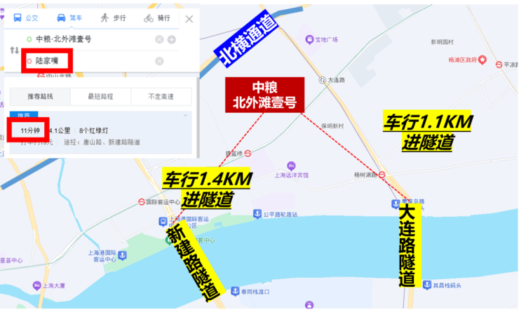 自驾上,项目往北约300米就是北横通道,往南车行约1公里,就是新建路隧道和大连路隧道直达浦东。从项目到陆家嘴、北外滩和外滩都在10分钟左右。