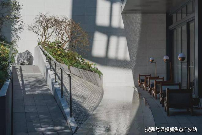 在入口景墙背后的水景之上,伫立着三块景石,通过对景石的形状进行模拟推敲,摹写中国传统文化中的“一池三山”,彰显东方文化意蕴之美。