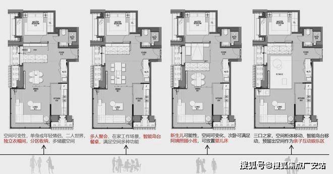自由灵活平面下的超前创新户型,移门移动柜创造出的可变次卧,适应了不同时间段的家庭结构(派对模式、二人世界、三口之家)和相应的生活场景。