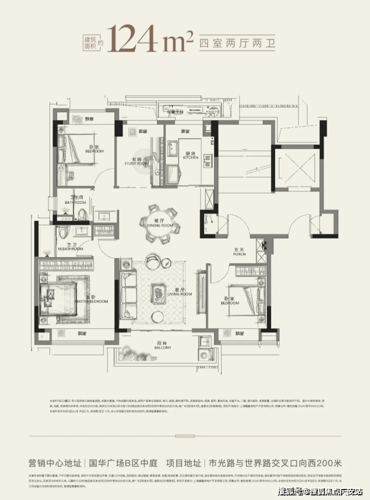 建面约124㎡的一步到位改善四房