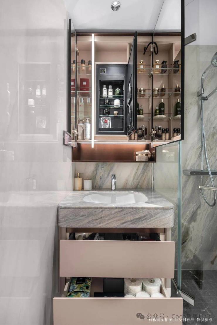 主卫收纳系统面面俱到,双面镜镜柜合理利用上墙空间,为收纳扩容,为化妆加分;美妆冰箱为护肤品、化妆品锁鲜;台盆柜巧妙隐藏日常洗漱用品,让卫生间保持整洁有序。
