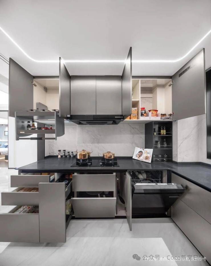 厨房收纳系统更是经过精心设计,吊柜收纳充分利用垂直空间,紧挨灶台的拉篮设计让调味品触手可及,分区抽屉让各类餐具、厨具各安其位,下厨更得心应手,台面更整齐美观。
