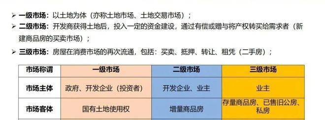 主要包括房地产买卖、租赁市场。含一级市场、二级市场和三级市场: