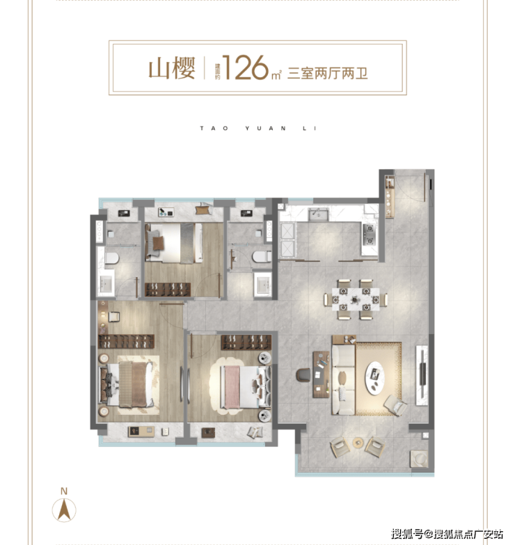 126㎡三房两卫(品质改善):总价 1030-1080 万;南北通透、宽厅设计、双阳台、得房率 78%