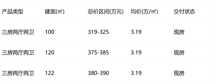 总价区间:100㎡约319-325万,120㎡约375-385万,122㎡约380-390万