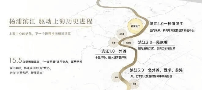 白玉兰广场、世界会客厅、百联滨江中心、美团上海科技中心、抖音上海滨江中心、LCM置汇旭辉广场、上海国际时尚中心、东方渔人码头、杨浦滨江景观带、丹东路渡口。