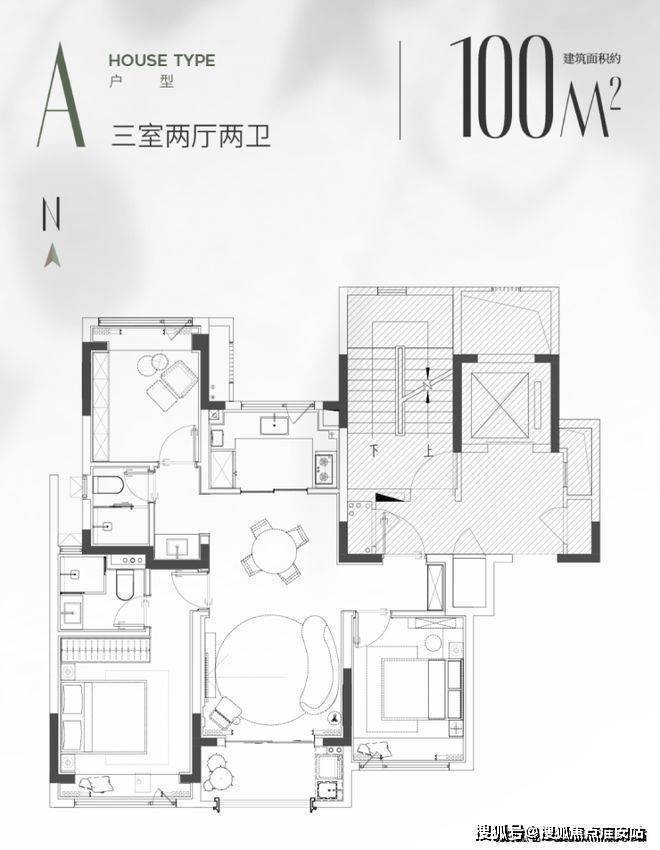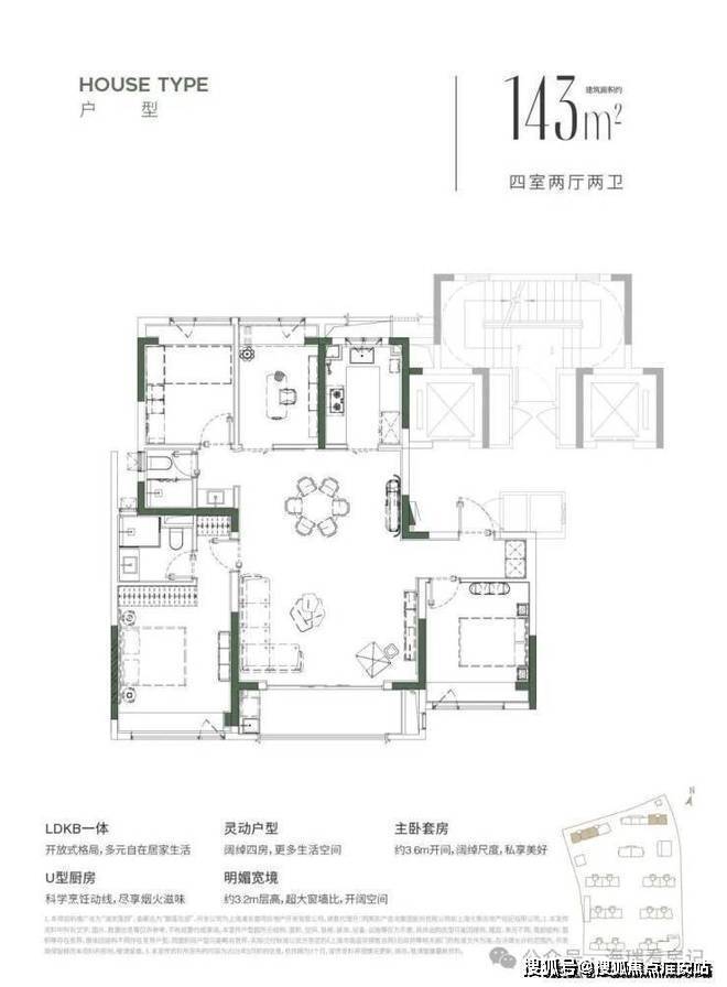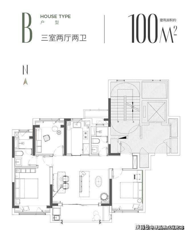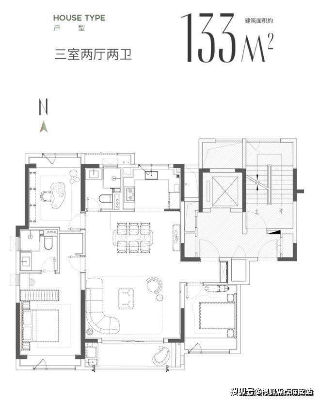 户型特点:建面约 100㎡的户型有多种选择,如经典飞机户型和大横厅户型,三开间朝南,主卧采用套房设计,U 型厨房操作顺畅;建面约 133㎡户型拥有超宽横厅和阳台,主卧自带衣帽间及独立卫浴。