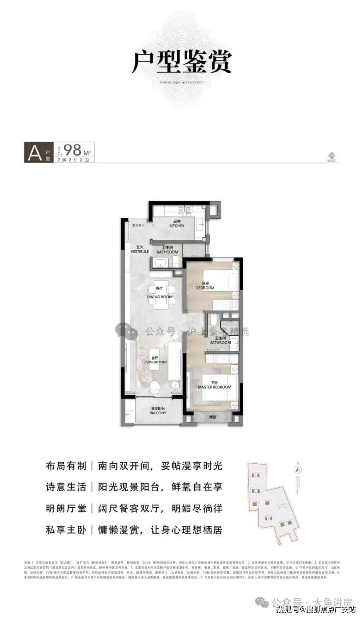 其中,建面约98㎡爆款户型,餐客厅一体化,连贯阔朗阳台,融合多维生活场景,实用性极强;双卧空间较为均衡,酒店式主卧带独立卫浴、观景飘窗;次卧空间宽适,可定制各类功能,适合单身、新婚、小太阳各家庭阶段……相比同面积段户型,以更舒适的空间尺度提升居住体验。
