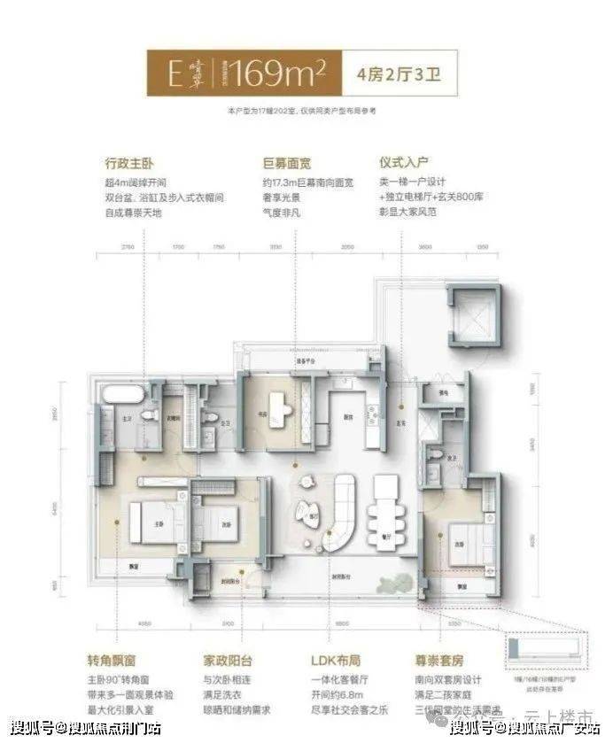 作为顶配户型,169㎡以 “四室朝南(五面宽)+17..3 米南向超长采光面” 震撼登场,堪称 “光影收藏家” 的理想之选。主卧配备景观大飘窗,主卫浴缸更能实现广角观景,生活犹如置身 “巨幕影院”。全明落地窗将窗外景致框入室内,收纳系统则贯穿家族生活 —— 新人的浪漫、孩子的成长、长辈的从容,都能在这个空间找到归属。无论是多代同堂的日常,还是家族聚会的热闹,这个户型都能以尺度与细节承载生活的温度。