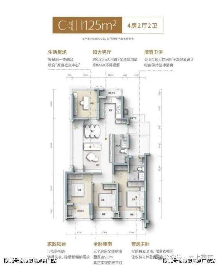 125㎡户型以 “6.25 米横厅 + 三房朝南” 成为性价比担当。U 型厨房与餐客厅联动,备餐时零食、餐具可 “丝滑归位”;6.25 米超宽横厅搭配全景落地窗,带来 IMAX 级的采光与视野体验。三房朝南设计让每个卧室都充满阳光,主卧为套房设计,预留衣帽间空间,次卧紧邻生活阳台,洗衣琐碎可轻松隐藏。
