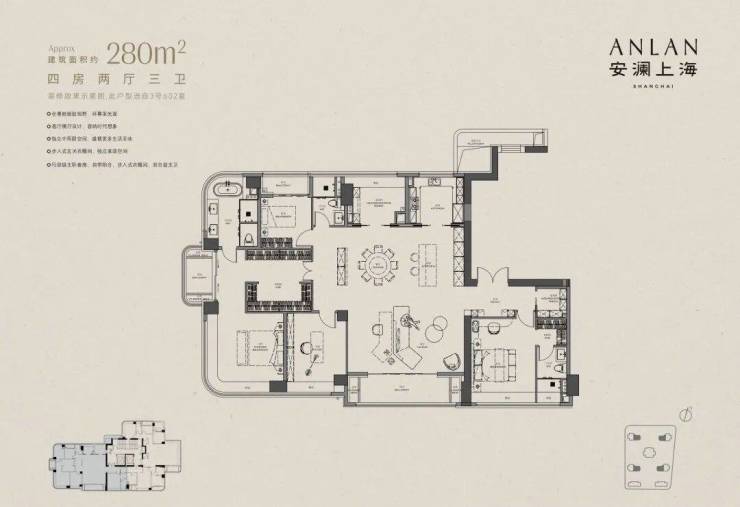 约275㎡四房三厅三卫:独立家政间,南北双阳台;