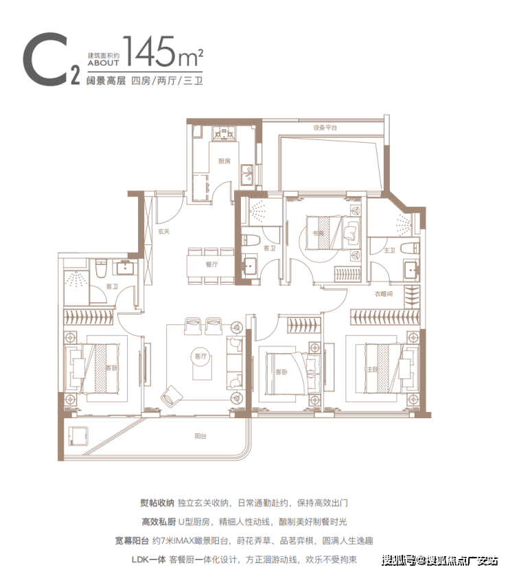 独立玄关、U型厨房、主卧大套间、三开间朝南大面宽等均为标配,堪称140㎡段的“完美四房”。
