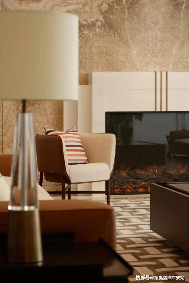 客厅主背景墙以奢华红色玉石为核心,搭配定制Hermes家具。