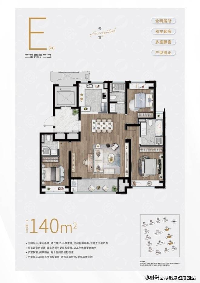 实用性方面,户型3房3卫、南向双套房的设计,可以保证每个家庭成员都能拥有更具私密性的居住空间。