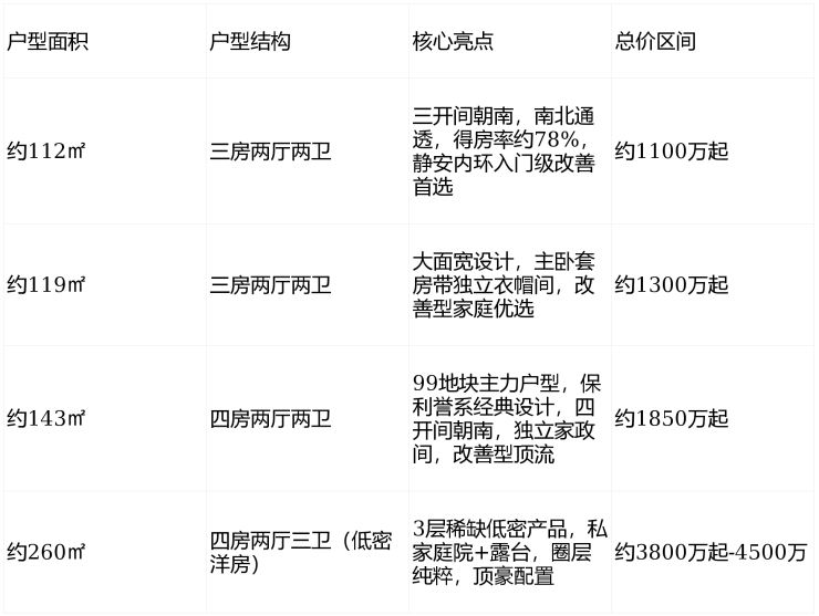 户型覆盖:建面约112-260㎡3-4房+低密洋房,从高端改善到顶豪低密产品全覆盖,满足不同客群需求