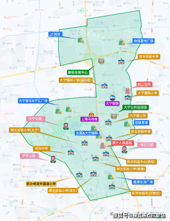 在原来的老闸北工业厂房拆迁后,大宁其实是从成片的空地整体规划开发,所以大家可以看到,这个区域是一个由中产豪宅+学区+交通+密集生活配套组成的强区。