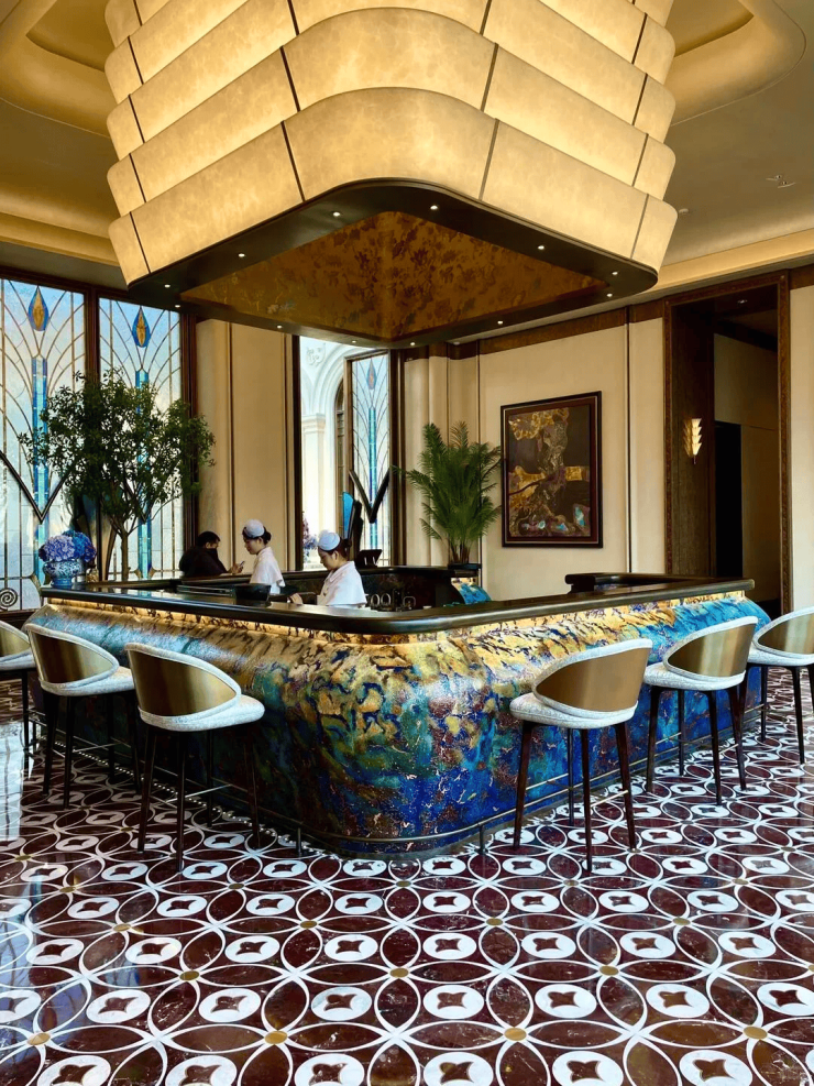 彩绘玻璃穹顶巧妙地散射着柔和天光,流光溢彩的艺术美韵在空间中浮动。艺术拱门与浮雕墙面交错排列,深刻诠释了海派建筑兼容并蓄的精髓。琴声悠扬,繁花烂漫,蓝紫色渐变色调描绘着季节的流转,共同构筑了一个融合自然、美学与温情的社交场域。