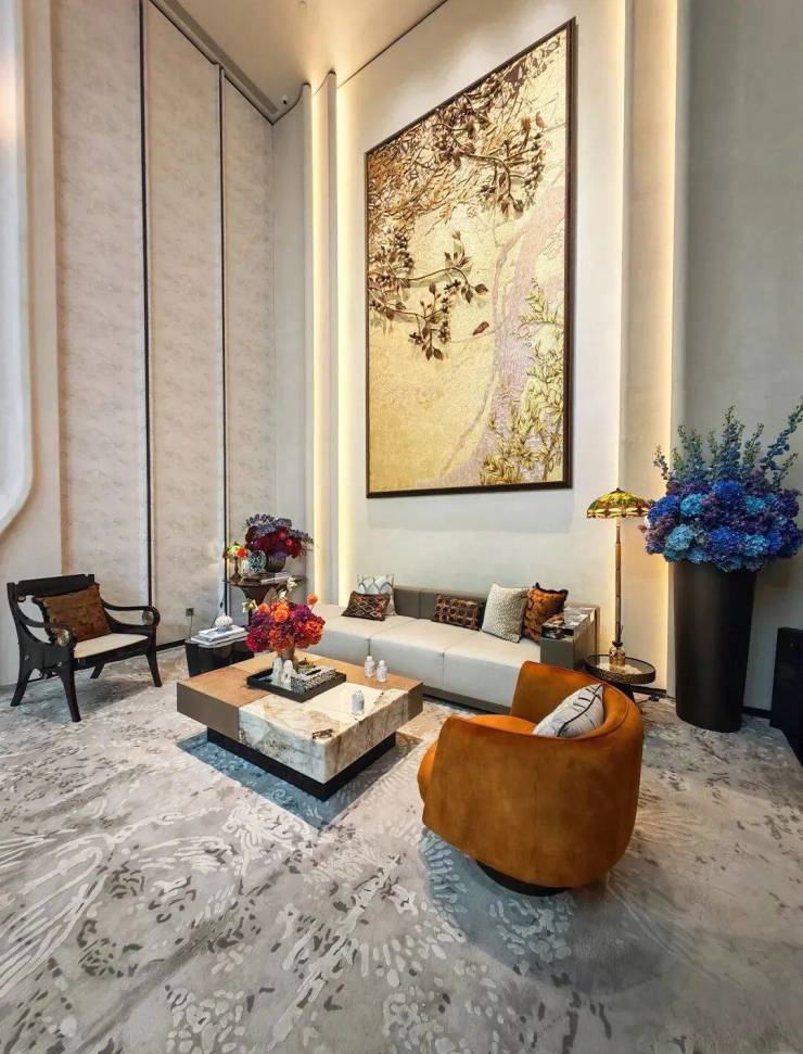 9米挑高大堂,致敬和平饭店经典风范,彩玻穹顶引天光入境,光影流转。中央屹立百羽栖澜艺术雕塑,象征尊贵与祥瑞。芦海宸韵非遗绣作,融汇五大非遗技艺,以针为笔,绣出海派归家的格调与雅韵。