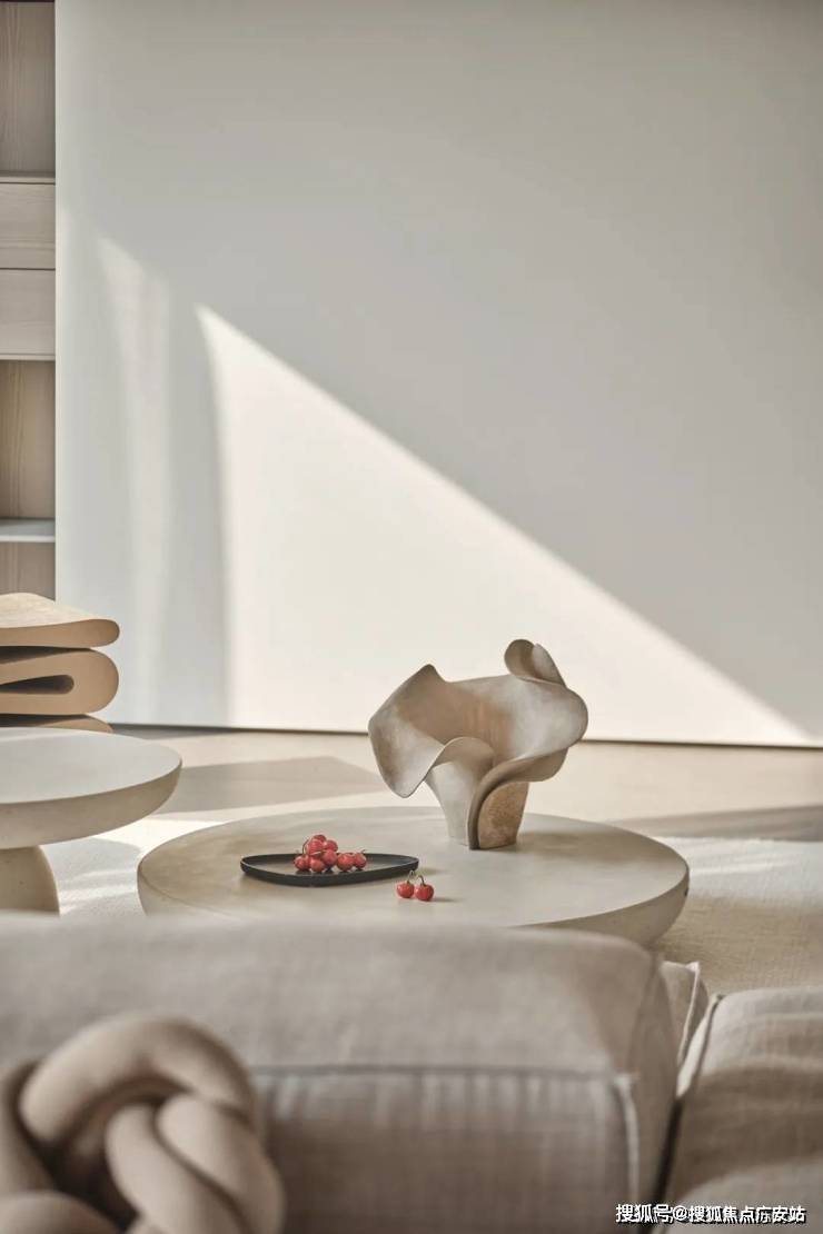 凭借温柔的弧形,优化了原始梁柱的琐碎感和锐利感,与木元素或纯色调糅合,让光影自由地流动。以玫瑰为灵感创作的单椅装点一隅,贵雅无比,茶几以叠层魅力与之对话,达成酝酿风雅的共识。