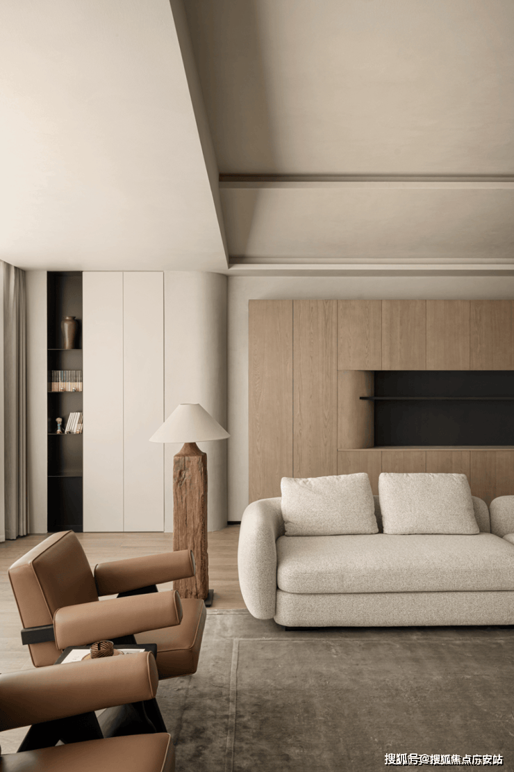 空间内随处可见的留白是设计赋予居住者自由思考的维度,同时也是空间灵动感的源泉,浅色地毯、L型沙发、皮革躺椅让家充盈且实用了起来。