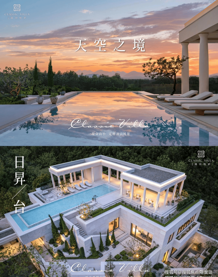 规划设计将盘旋上升的西南角位置,设置为示范区接待会所“日昇台”,这座“城市灯塔”以希腊雅典卫城作为灵感来源,汲取其平坦的屋顶和优雅的廊柱,成为周边山脉最美的框景,同时建立其内外空间的流动性和开放性。顶部局部悬空的景观泳池,增加场所的休闲度假感,其设计的巧妙之处在于水面的视线可延伸至夕阳,当晚霞洒满天空,仿佛置身于天空之境。