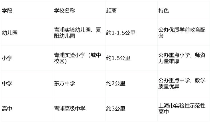 教育配套:直线3公里范围内覆盖25所幼儿园、11所小学和11所中学,小学包含上海政法学院附属青浦东门小学、青浦瀚文小学等,中学涵盖青浦区实验中学(东校区)、上海青浦第一中学等,还有实验小学、东方中学等学区相关院校。