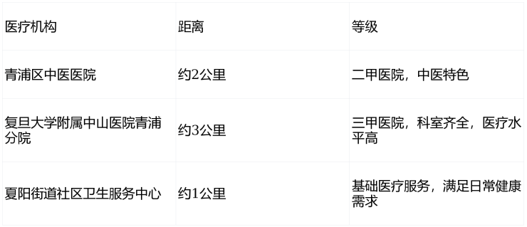 医疗配套:直线3公里内有7所一级及以上医院,青浦区中医医院距离楼盘1.3公里,复旦大学附属中山医院青浦分院距离2.6公里,可满足日常就医需求。