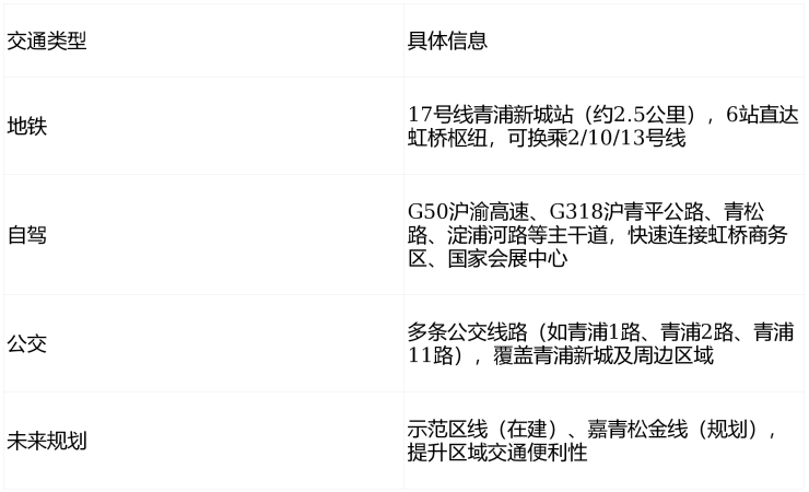 🚇地铁步行距离:距17号线青浦新城站约2.5公里,步行需25-30分钟,公共交通便利性一般,需依赖自驾或公交接驳