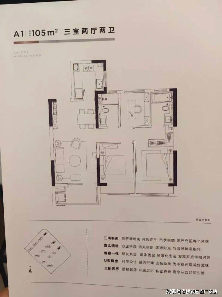 105㎡:三房两厅两卫,南北通透,动静分区。