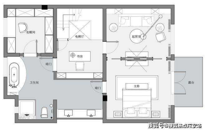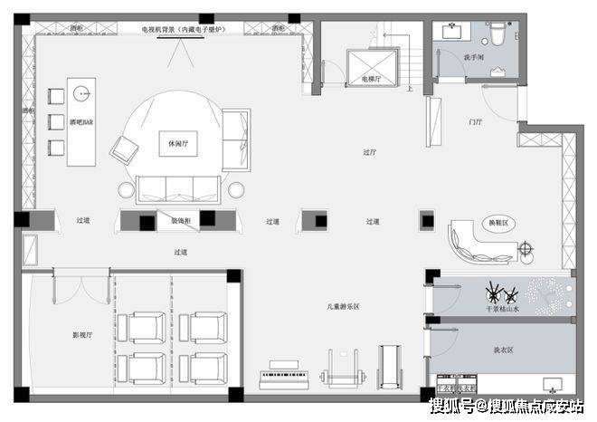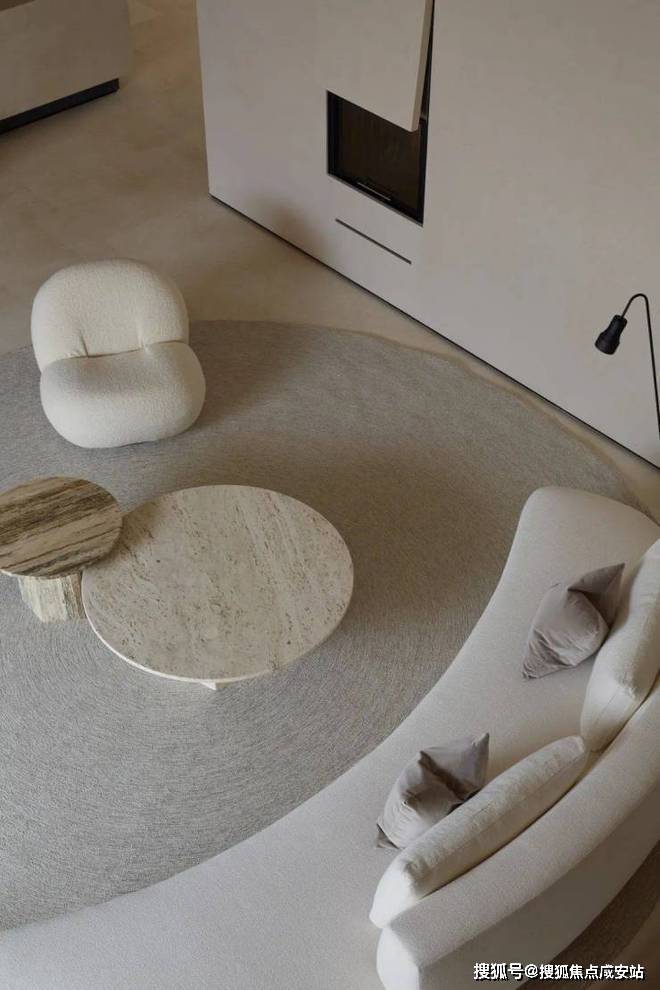 空间是光影的容器,自然光穿透白色的纱帘给会客厅加了一层摩登的滤镜。两侧纱帘光影通透,暗香浮动,几丝波影乍如烟。一处吧台,临烟火,酌清欢。烟火清欢,一半一半。