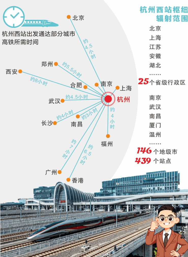 作为杭州市唯一特级TOD,城西科创大走廊核心节点。依托高速铁路辐射整个长三角区域,串联杭州、上海、南京、合肥、温州等大型城市,打造“浙江省1小时交通圈、长三角2小时交通圈”。最快班次可实现63分钟到上海、84分钟到温州、4.5小时到北京。待沪乍杭高铁建成,西站还将实现40分钟到上海。(数据来源:12306;杭州市人民政府)