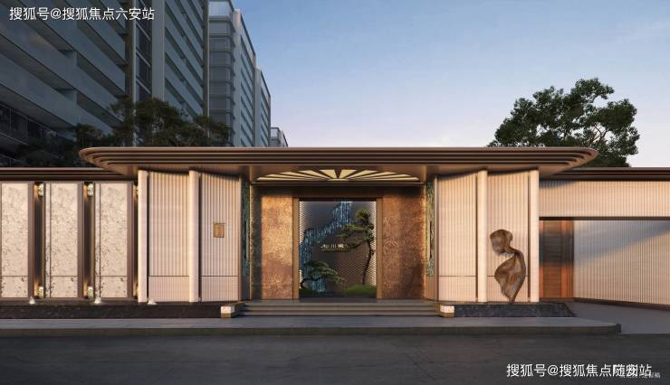 以《溪山行旅图》《松阁观潮图》为灵感,园区大门打造约80米礼仪门庭、25米叠级水景,雕塑《川涌》重构门庭精神。设计摒弃传统元素复制,通过现代语言转译宋代美学,使松、川意象融入墙面雕花、地面石材,构建独特文化印记。