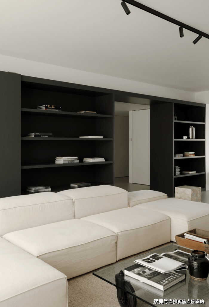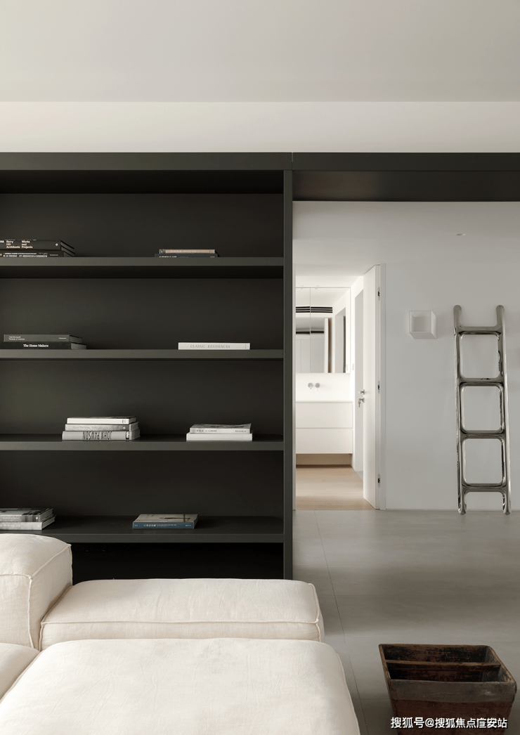 客厅沙发背后的深灰色烤漆书墙背后是书房的所在,以一扇2m长的深灰色烤漆移门控制开合,形成,形成“1+1”的可变空间组合。