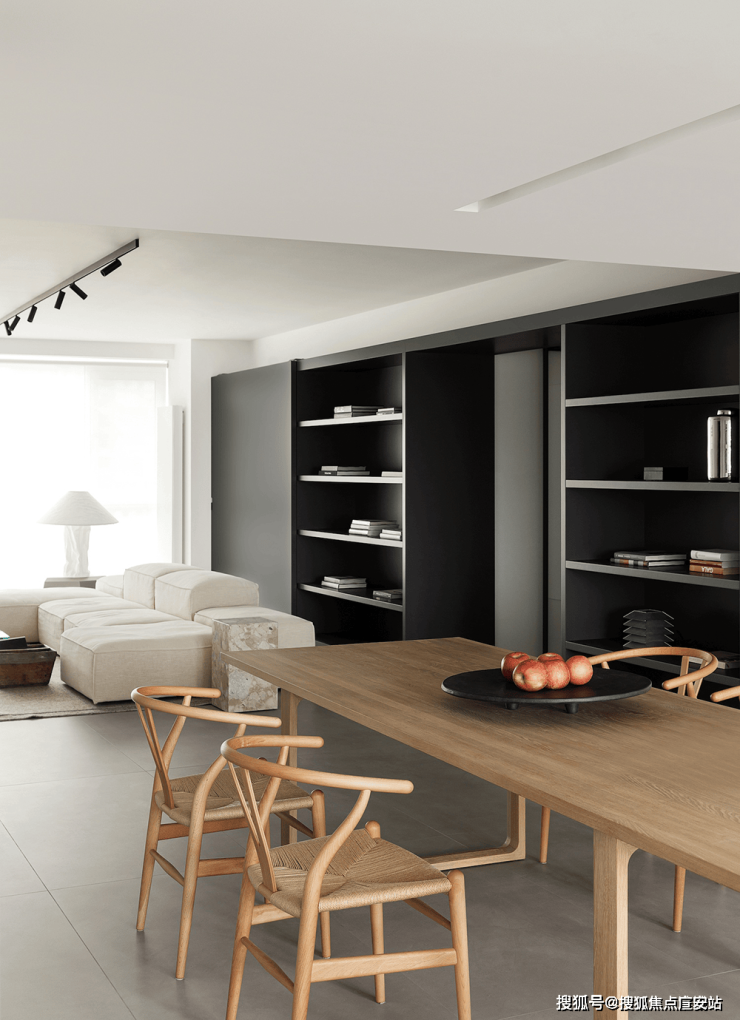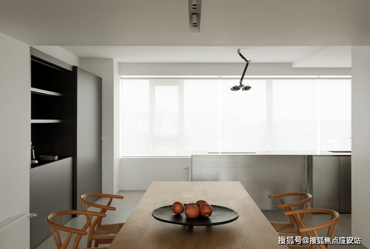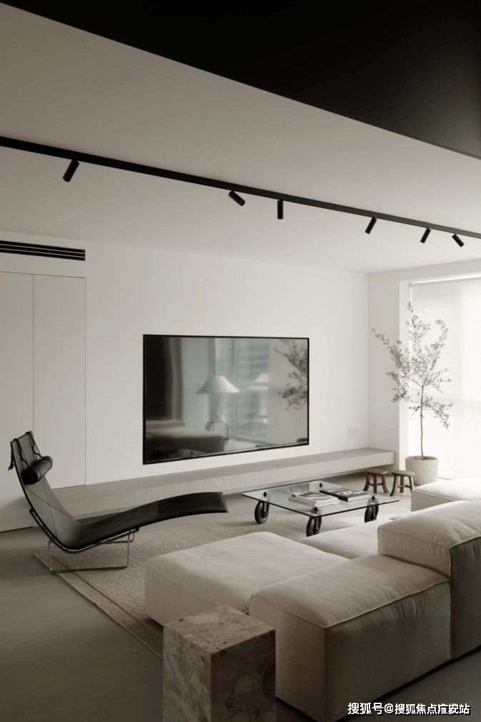 四白落地的墙面,浅灰色混凝土地坪和无主灯设计,让空间更加简洁干净的同时,也为屋主希望‘家’和‘画廊’空间的结合成为可能。