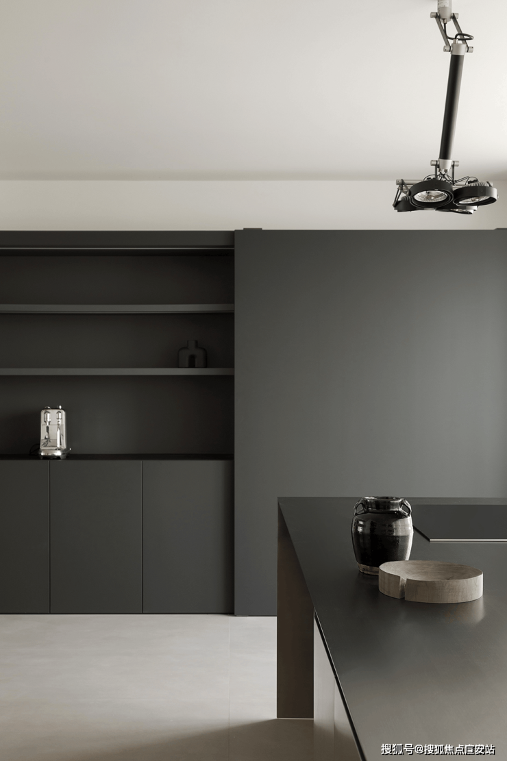 岛台一侧,黑色厨柜内设燃气灶,作为中式厨房的天地,偶尔的爆炒蒸煮都不在话下。