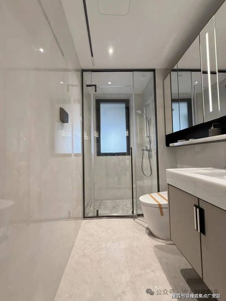 奢石台面,皮革饰面柜抽屉,侧端设置金属收纳开放格;定制镜柜,中间的透光玉石直接提升了高级感,镜柜内部配备了美妆冰箱+美妆灯条+轨道收纳!