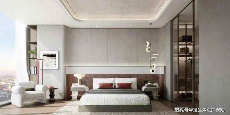 主卧的空间相对较大,背景是利用左侧的窗帘做的对称硬包的处理,其实后面有暗藏的灯带,使层次更为丰富一些,整体的家私和风格的感觉延续客厅,注重品质和空间的感受。