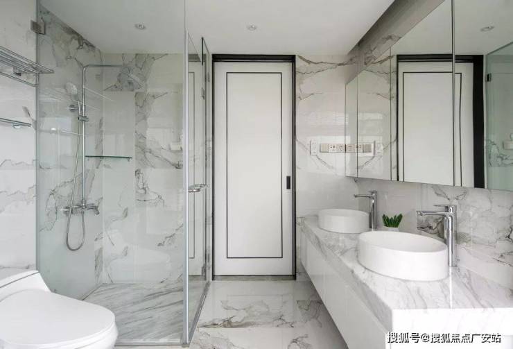 淋浴房做在内侧做了干湿分离的设计,保证了动线的流畅也不影响浴缸和马桶区域的视野。