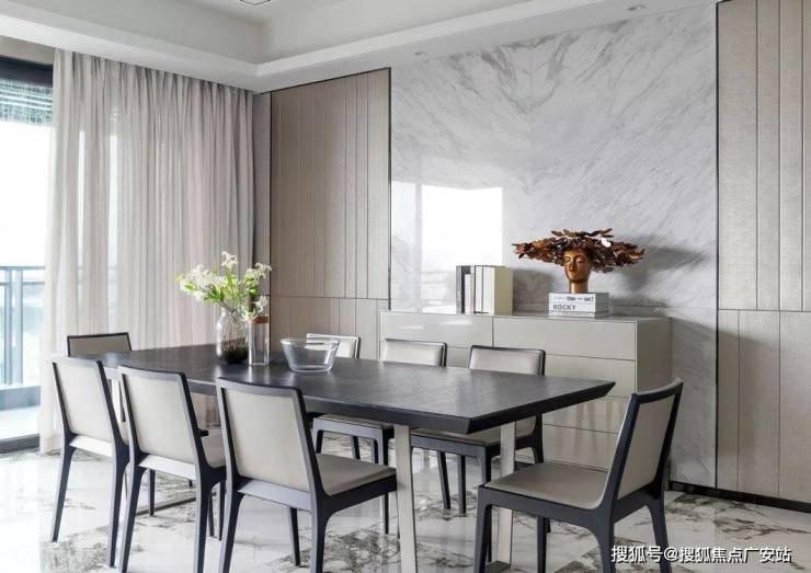 餐厅背景墙十分简单,用了简洁的理石和硬包分缝来做配合处理,餐边柜和餐椅的颜色呼应,深色的餐桌在浅色的空间处形成明度上的差异。