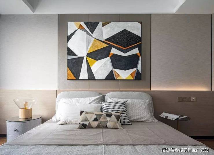 床头细节用了户型的设计,这样即让背景有了一个围合的感觉,弧形向上的高度让后面的硬包处多了一个灯带的位置,丰富了一些层次。