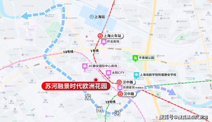 整个小区由汉中路、长安路、普济路与恒丰路围合,临近汉中路地铁站和苏州河滨河景观带。苏河融景整个小区分2期开发,其中1号2号一期开发,其余楼栋二期开发。