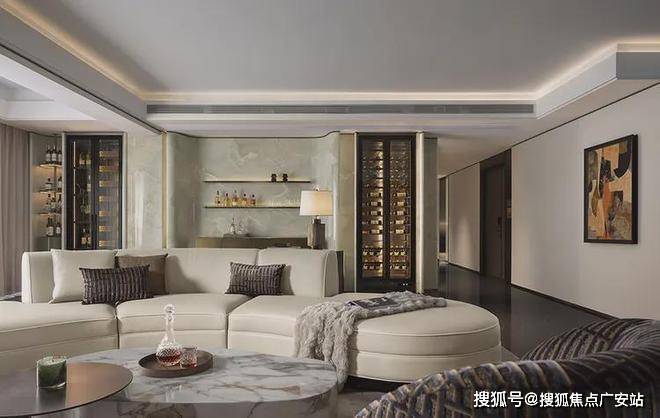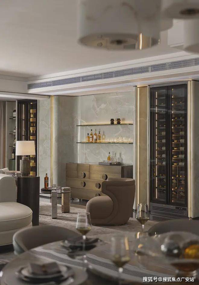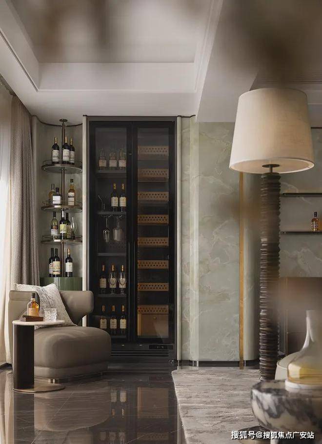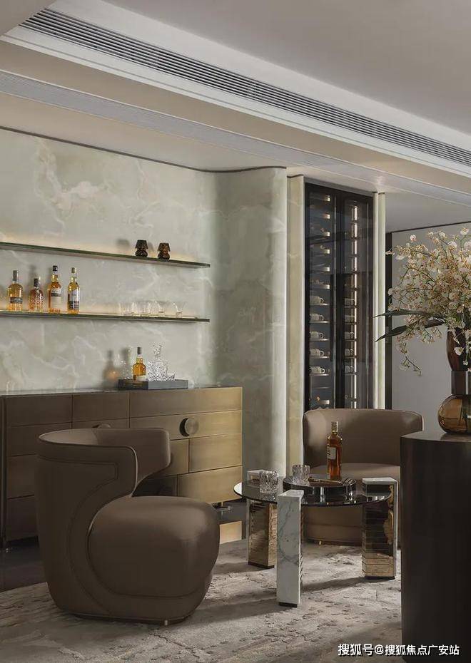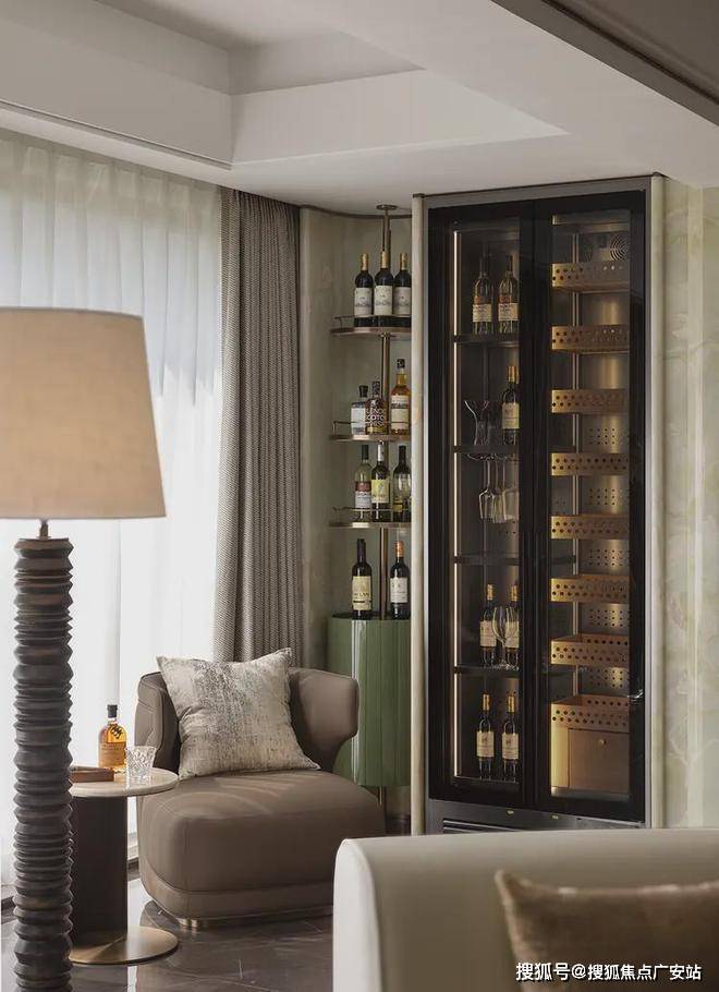 弧形沙发后的一组休闲椅,旨在实现生活方式及场景需求的变换组合。既是茶台,亦可是开放的亲子空间。同时有效利用墙体和飘窗,定制丰富的藏酒区,以美学介入未来生活,透露居者品味之余,让这一隅也拥有着无限延展性。