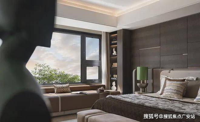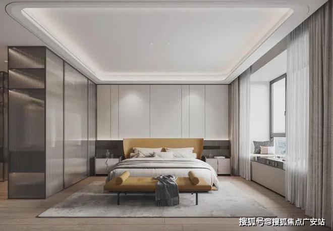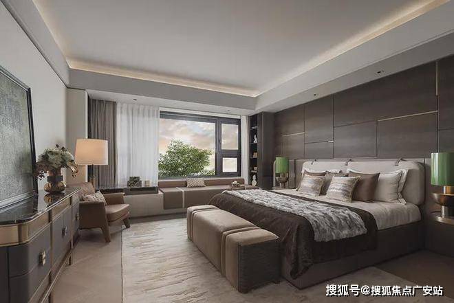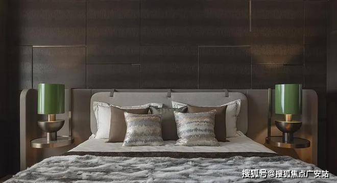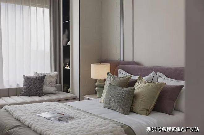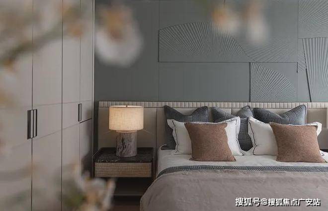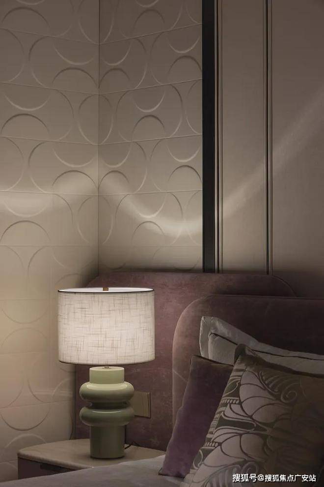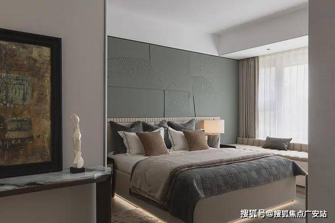 次卧延续开篇仪式感,以特殊工艺手法打造的床背极具特色,床头柜与飘窗一体链接,与整体流线相结合,勾勒出丰润舒畅的状态。突出的材质纹理,以涓涓细流述说着生活的诗意。