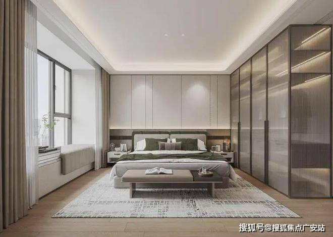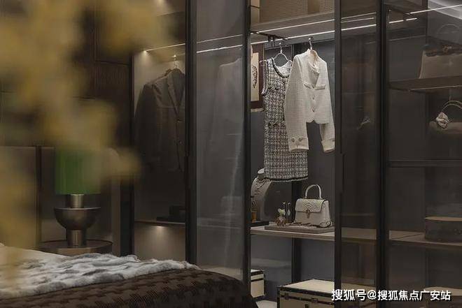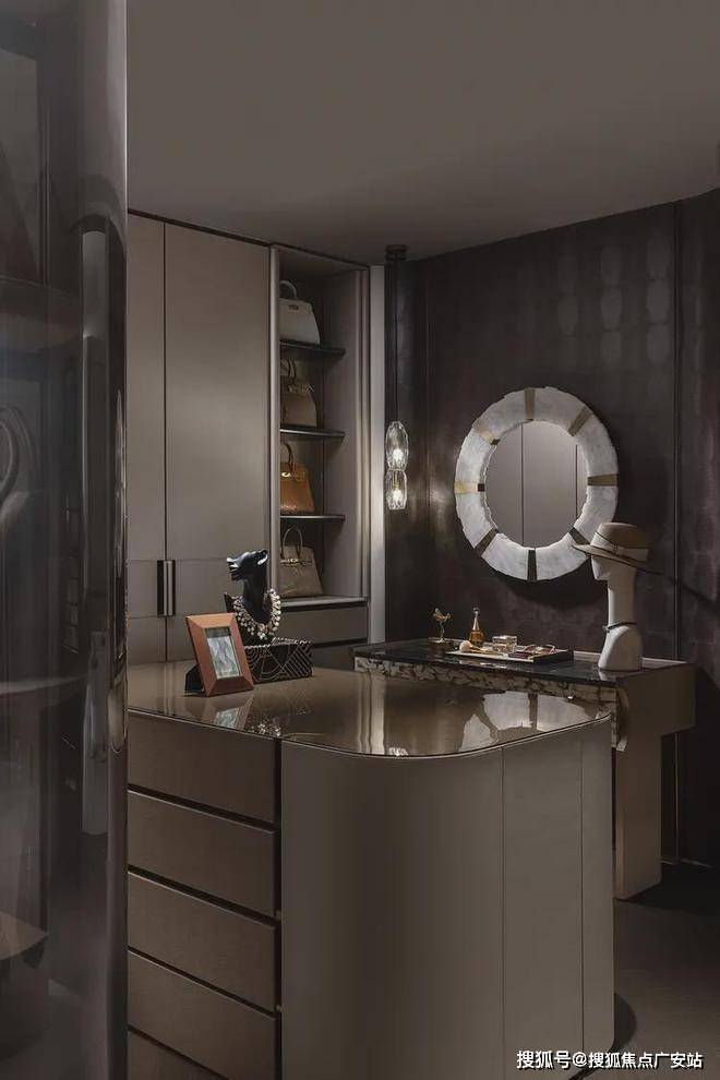 主卧对功能区进行重新划分,并以衣帽间相迎,打破传统布局。岛台设置形成洄游动线,并以开放格、玻璃门、封闭柜门相结合的形式,满足男女主人各自的服饰、配饰、包包等收纳的需求。