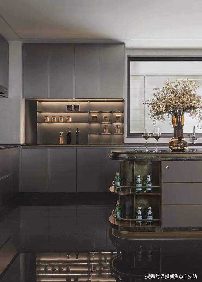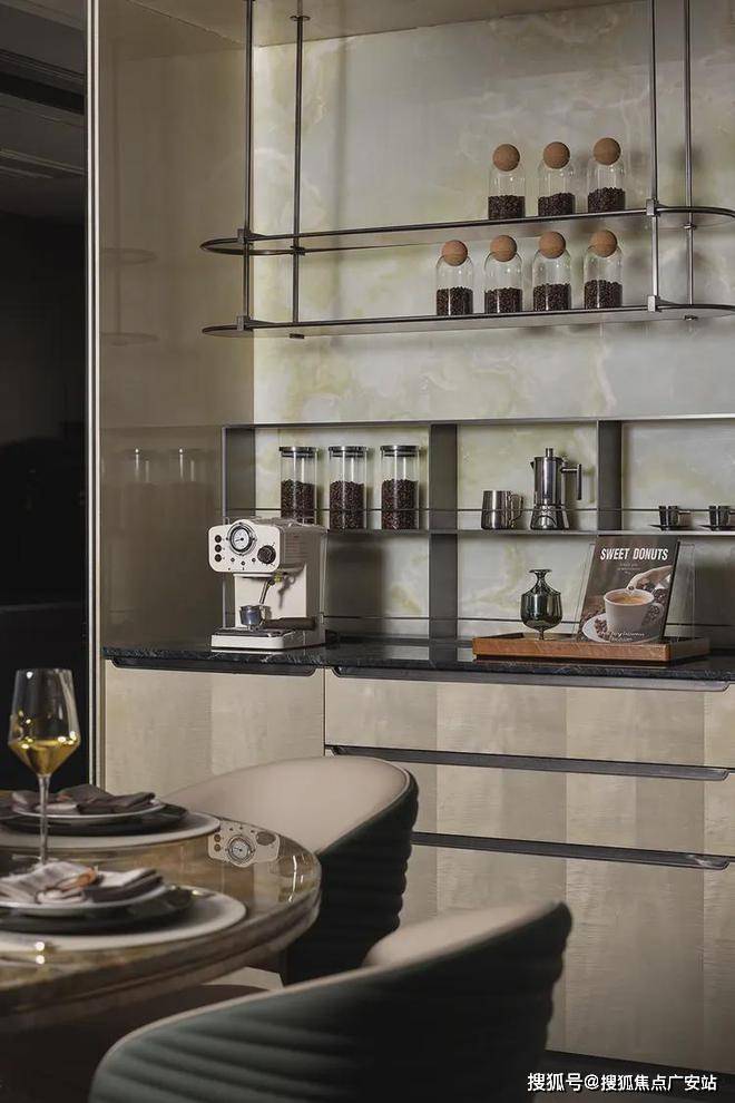 岛台作为有效补充,承接日常工作区与休闲区的需求使用,在局部金属置物架的包裹下,照亮质感生活。