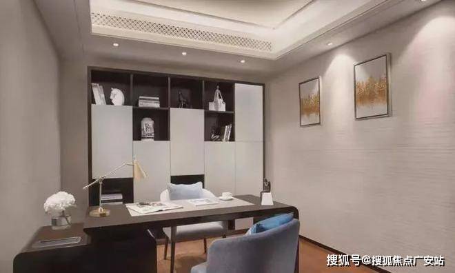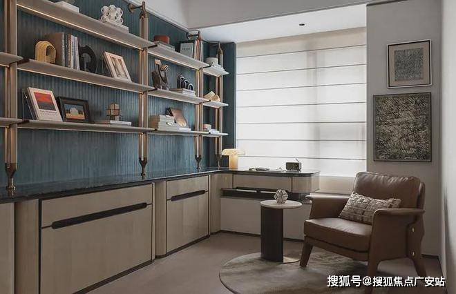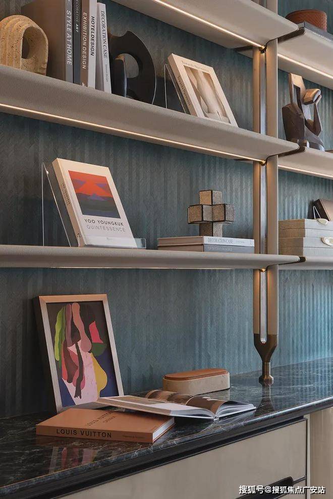 集收藏、私享于一体的书房区,摒弃冗杂的装饰,展示架墙面与特殊木纹墙纸拼接,勾勒出立体层次。同时利用柜体增设折叠床,以灵活实现展开或折叠之态,打造成多功能灵动空间。