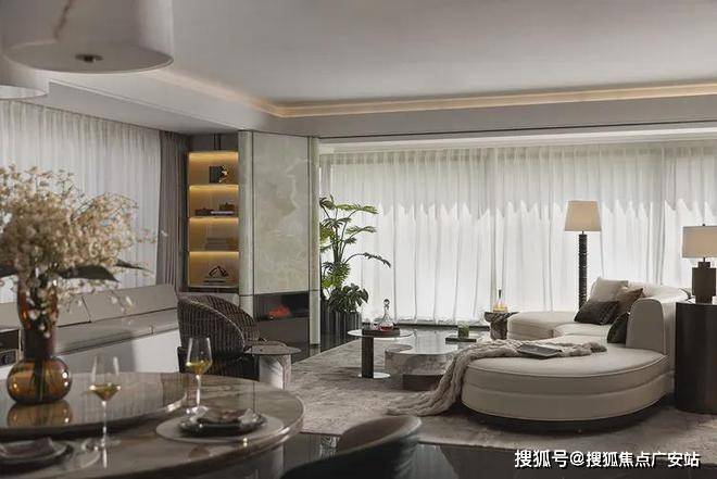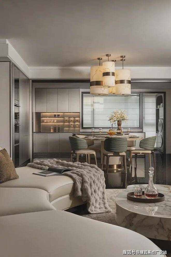 约270°的环幕视野,让阳光肆意倾洒,观景效果极佳。光影勾勒形体,色彩渲染风格,以打造能量社交场。视觉的温暖和青玉石带来的温润质地,在淡雅柔软的饰面映衬下,散发着慵懒惬意之感。