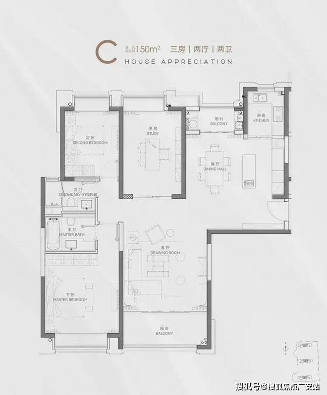 主力户型:2房133㎡、2+1房135㎡、3房150-154㎡