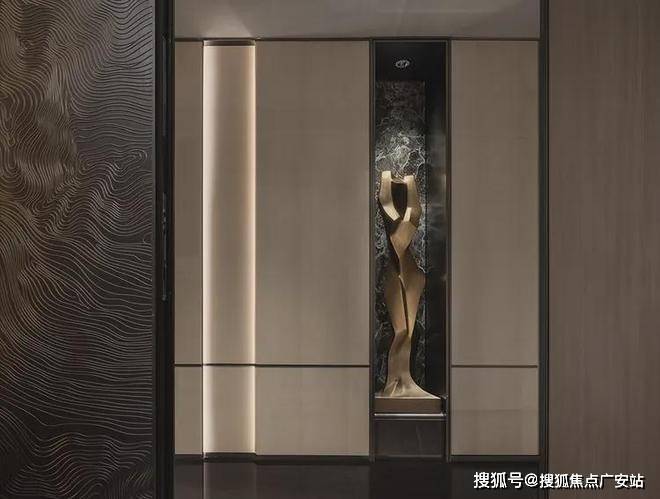 玄关作为家宅之始,便以温暖材质与柔和灯光相迎。通顶柜体的设计,暗藏存储空间,让出行与归来皆倍享自在。辅以嵌入的雕塑艺术,既是端景,又可机动变换为节日活动主题元素,在方寸之地赋予入户无限可能。