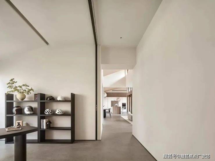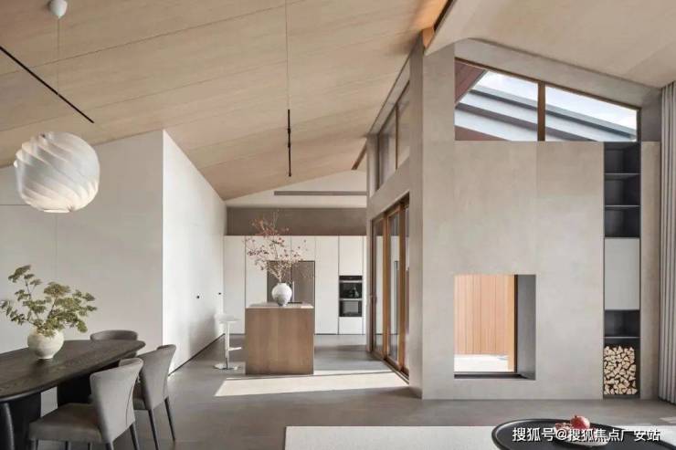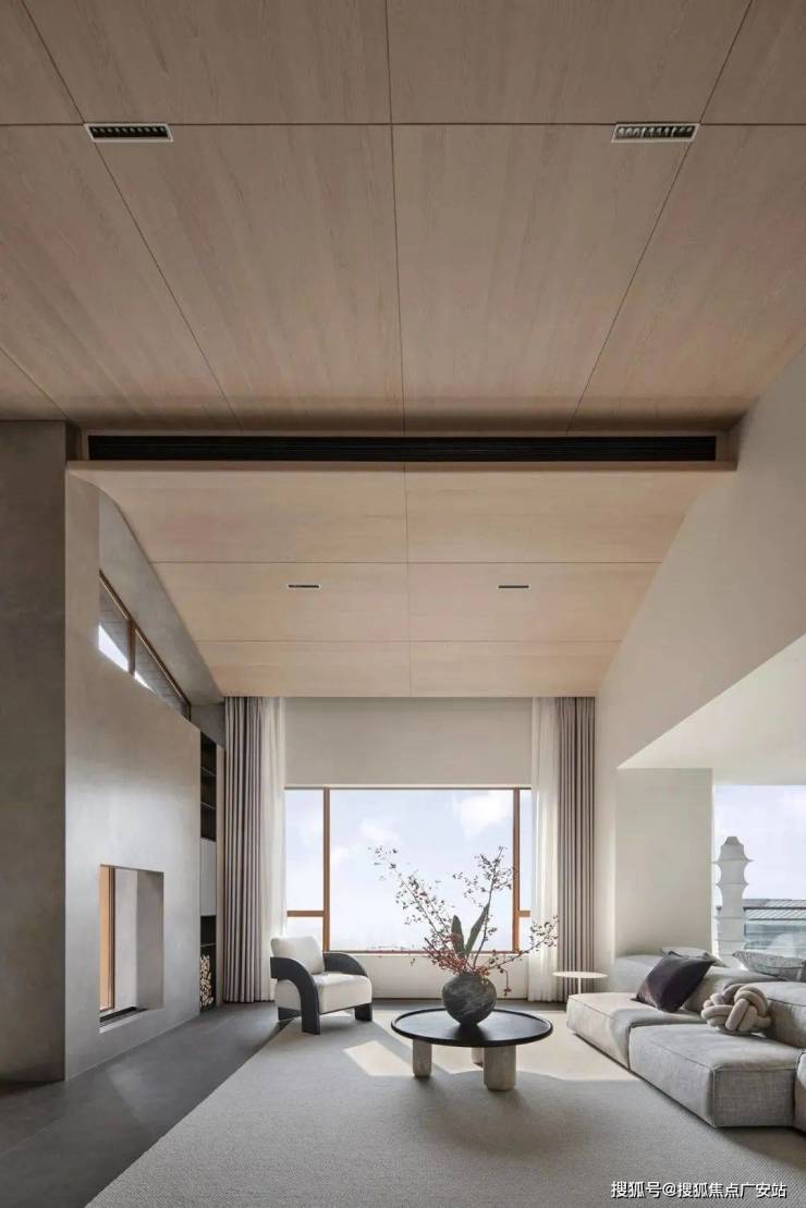 倾斜的吊顶和特意做出的错落 “断层”,增强了空间的纵深感。这种感觉不是来自单一方向,而是四面八方的张力共同形成的。